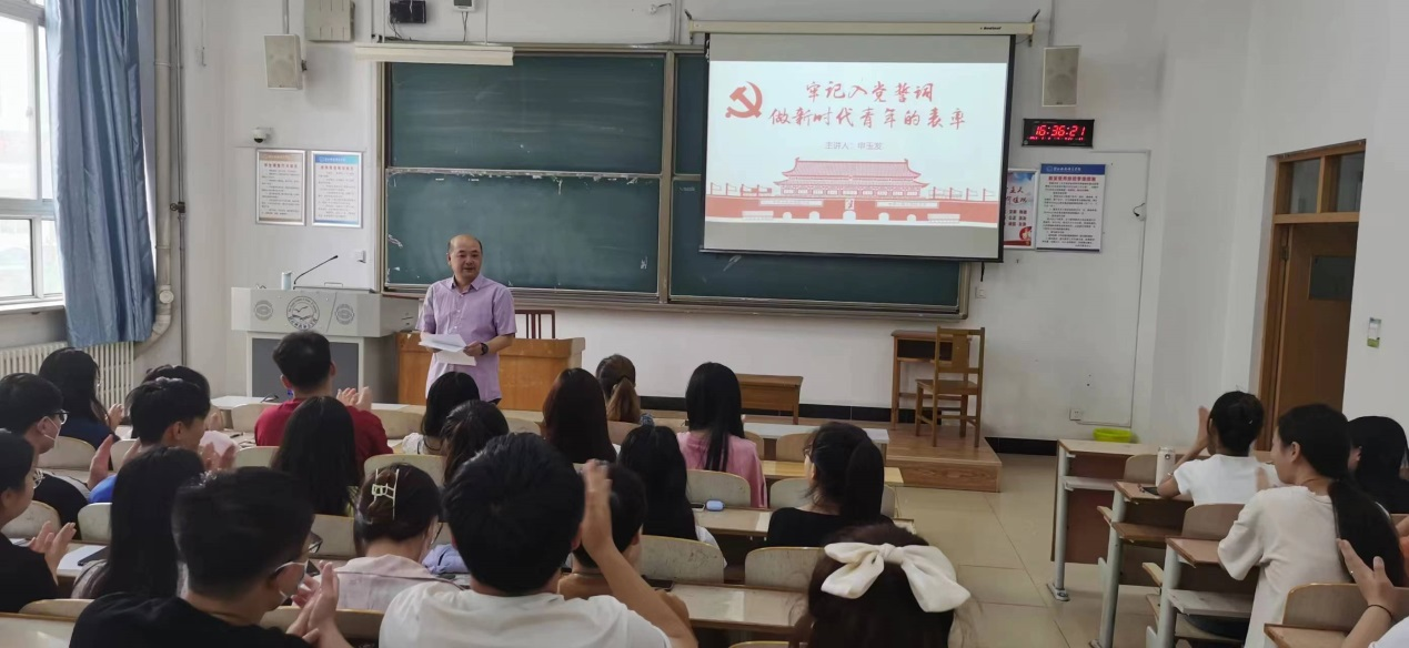 6月8日下午,澳门十大信誉网赌大全党委书记申玉发为全体毕业生党员讲授以“牢记入党誓词,做新时代青年的表率”为题的专题党课。