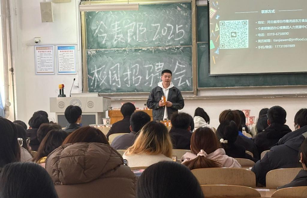 在互动环节,同学们踊跃提问,就职业发展路径、薪资待遇、培训体系等问题与今麦郎的宣讲人员进行了深入交流。宣讲人员耐心细致地解答,让同学们对今麦郎的用人机制和福利待遇有了更清晰的了解。不少同学表示,今麦郎广阔的发展空间和丰富的晋升机会极具吸引力。而此次今麦郎宣讲会,为同学们打开了一扇了解食品行业头部企业的窗口。相信通过此次宣讲,会有更多同学对食品行业产生浓厚兴趣,未来积极投身其中。