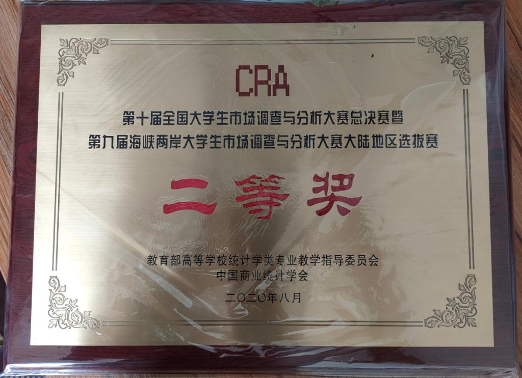 2020年8月3日至8月24日,在第十届全国大学生市场调查与分析大赛总决赛暨第九届海峡两岸大学生市场调查与分析大赛大陆地区总决赛中,由澳门十大信誉网赌大全应用统计学专业王晓蕊、张莎莎、李朔颖、赵嘉星、许杭五名学生组成的“茶杯小分队”,在刘思严、常竞文、刘青三位老师的指导下,取得国家二等奖的佳绩,另有两参赛作品获得省级三等奖。